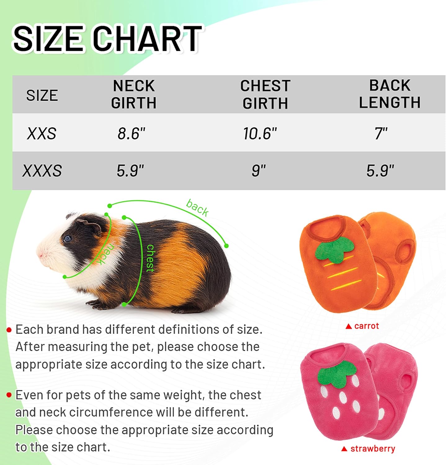 - This small animal clothes have 2 sizes to choose from, 2XS and 3XS, suitable for most small animals, such as: adult guinea pigs, ferrets, rabbits, kittens, mini dogs, chinchilla and other smaller animals. 3XS (Neck:5.9″, Chest:9″, Back Length:5.9″ ),suit for small animal under 1LB; 2XS (Neck:8.6″, Chest:10.6″, Back Length:7″ ),suit for small animal under 2LB.As each has different size definitions, please refer to the size chart to select the appropriate size before buying.